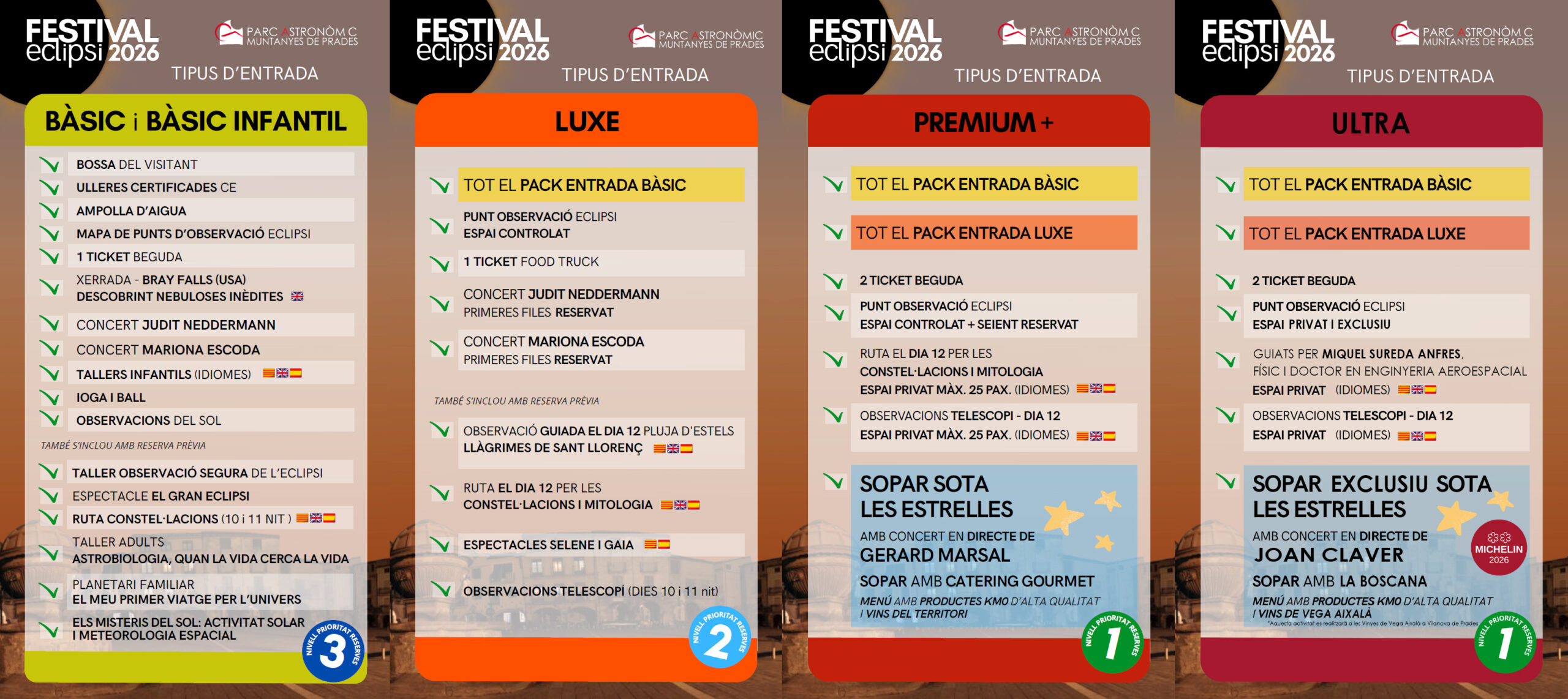 El pack PREMIUM+ incluye concierto en directo de @gerard_marsal_norte , y una fantástica CENA BAJO LAS ESTRELLAS con MENÚ DEGUSTACIÓN tematizada con temas astronómicos 🔭 También sillas reservadas tanto a los conciertos como al eclipse total de sol ☀