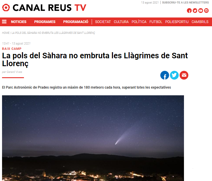 La pols en suspensió provinent del Sàhara i l’onada de calor han enterbolit l’aire, deixant poca visibilitat al cel per observar les Llàgrimes de Sant Llorenç. Tot i això, des del cel nocturn més fosc del Camp de Tarragona, Prades, s’han pogut observar les Perseides amb la claredat de sempre.