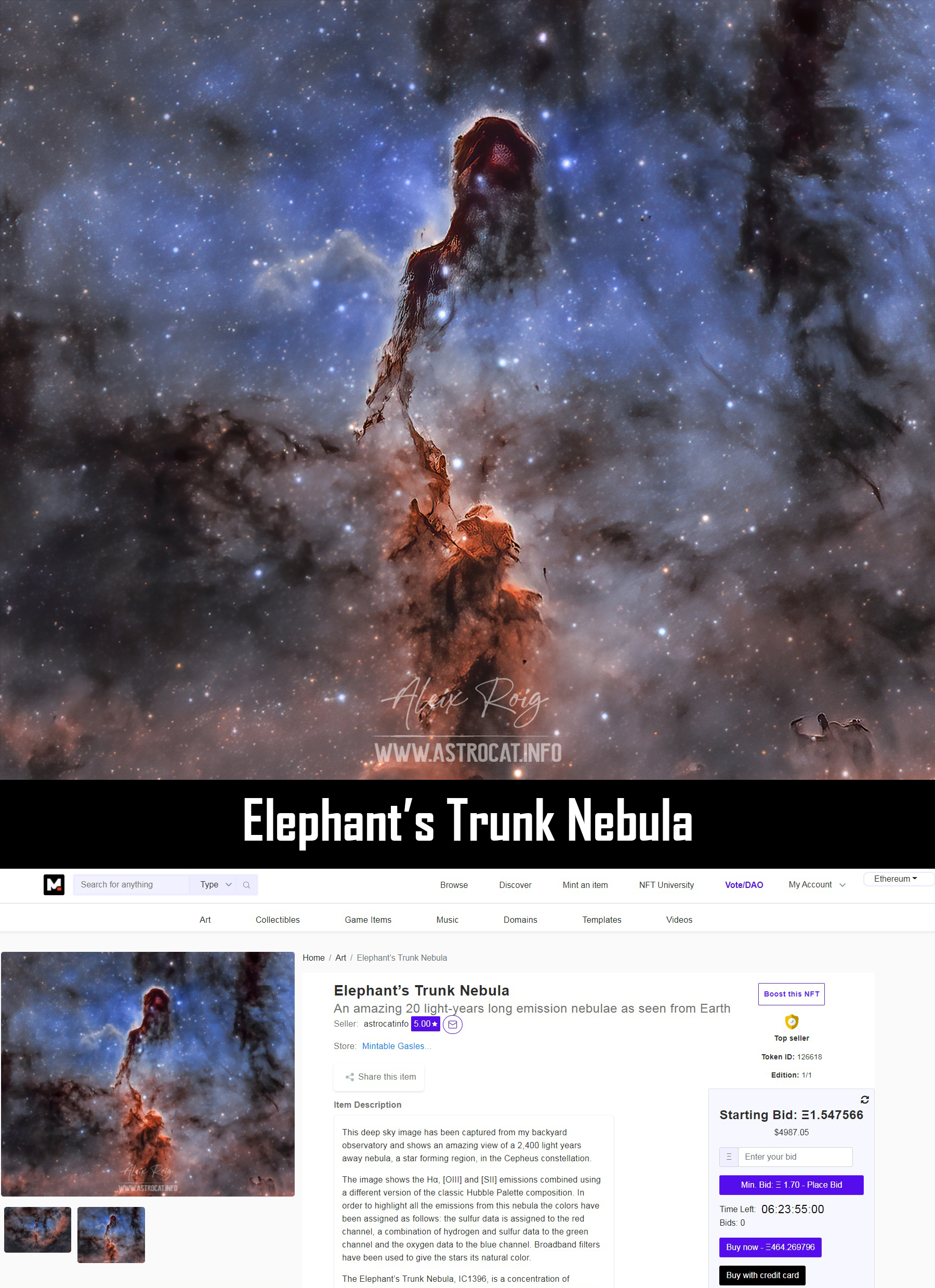 Veure la subhasta: https://mintable.app/art/item/Elephants-Trunk-Nebula-An-amazing-20-light-years-long-emission-nebulae-as-seen-from-Earth/y36xS_MrhagRonh
